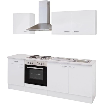 Die vorkonfigurierten Küchenzeilen überzeugen durch ihr Design und die vielfältigen Funktionen. Die Türen der Schränke sind sowohl für den links- als auch rechtsseitigen Aufbau vorbereitet, was Ihnen ein Höchstmaß an Flexibilität bei der Montage bietet. Die hochwertigen und pflegeleichten Kunststofffronten und die stabile Bauweise der Schrankkörper garantieren Ihnen lange Freude an Ihrer Küche. Eine Arbeitsplatte im passenden Design gehört bei dieser Küchenzeile mit dazu.