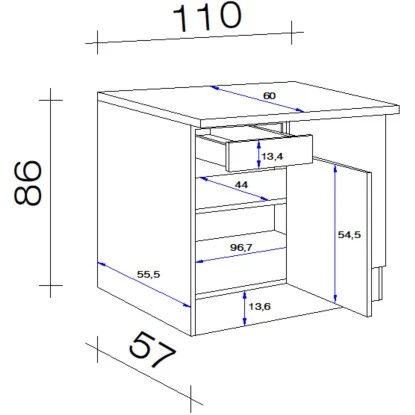 Der 110 cm breite Eck-Unterschrank weiß durch eine hochwertige Verarbeitung sowie Materialauswahl zu gefallen und garantiert Ihnen auch auf kleinen Flächen ein Höchstmaß an Stauraum. Dabei verfügt der kompakte Eck-Unterschrank neben einer Drehtür auch über einen Schubkasten und einen Einlegeboden.