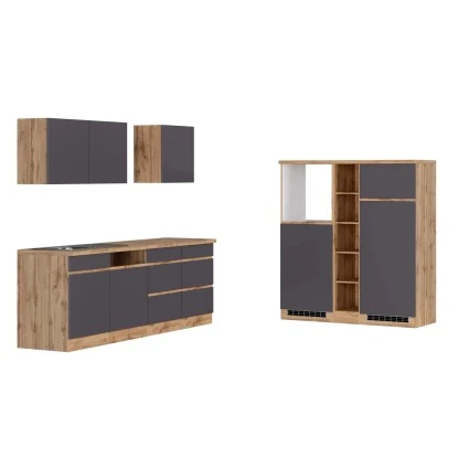 Die Küchenzeile Turin von Held Möbel mit hochwertigen MDF-Fronten begeistert optisch durch die klaren Linien sowie die zweifarbige Gestaltung. Da die Schränke in zwei Farbkombinationen verfügbar sind, können Sie die Küche im Mix-and-Match Stil erweitern. Zusätzliche Akzente werden durch die 38 mm starke Arbeitsplatte im Beton Dekor gesetzt.