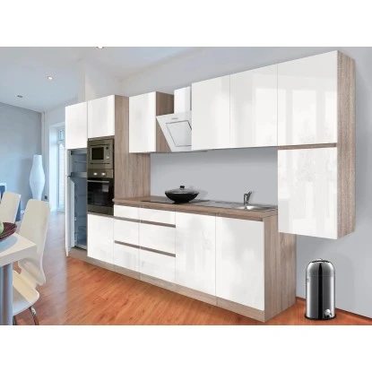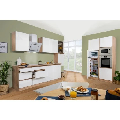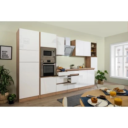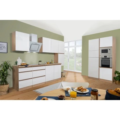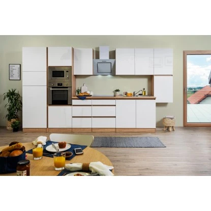 Respekta Premium Küchenzeile Grifflos 385 Cm Weiß Hochglanz-Eiche Sägerau